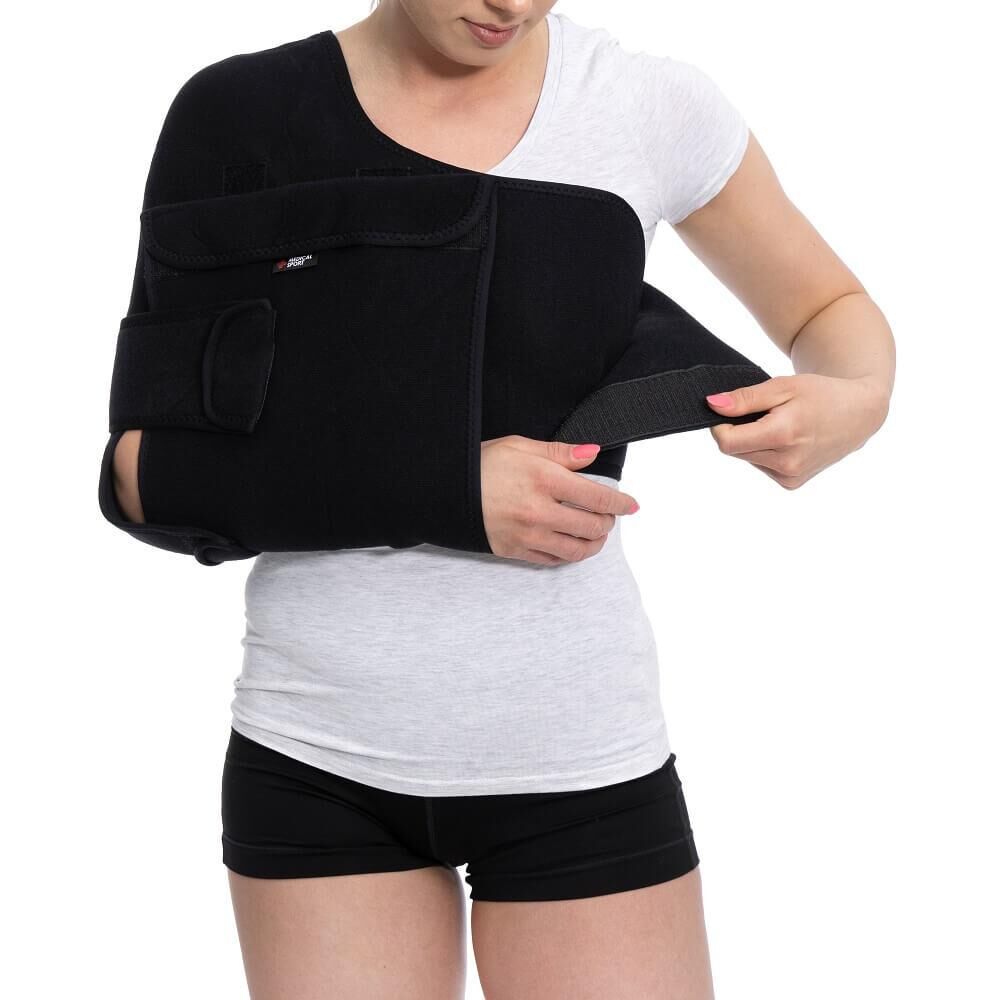 • orteza ustawia ramię w przywiedzeniu i rotacji wewnętrznej w stawie ramiennym, a staw łokciowy i przedramię utrzymuje blisko tułowia