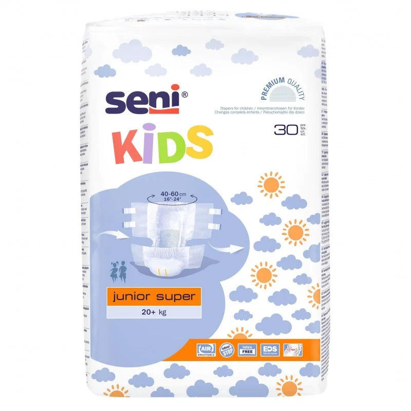 Seni Kids Junior Super to wygodne pieluchomajtki zapinane na rzepy dla dzieci o wadze powyżej 20 kilogramów, o obwodzie w pasie od 40 do 60 cm. Przeznaczone dla dzieci cierpiących na nietrzymanie moczu, które wyrosły z tradycyjnych pieluszek, a wyroby Super Seni w najmniejszych rozmiarach są dla nich wciąż zbyt duże. Chłonne i wygodne w noszeniu, z dwu-paskowym indykatorem wilgotności. Zapewniają swobodę ruchu i komfortowe poczucie suchości. Produkt przeznaczony dla dziewczynek i chłopców.