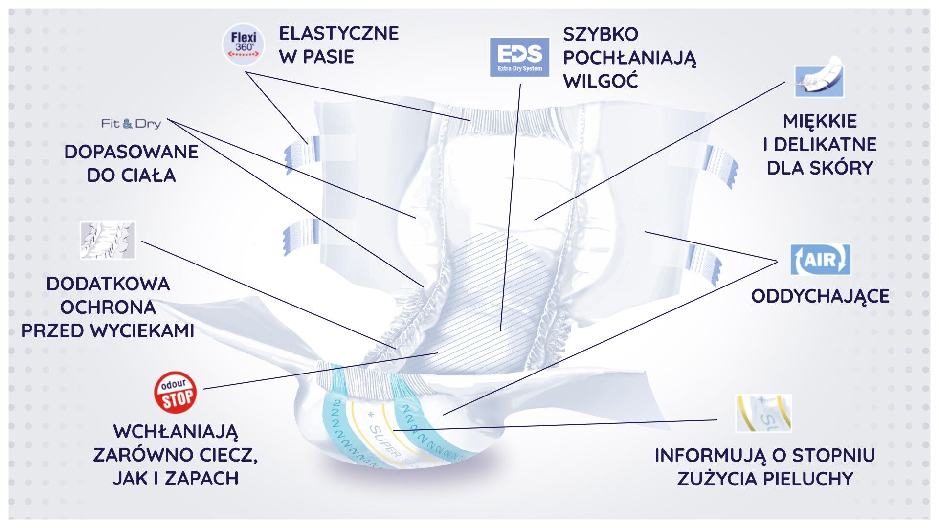 - Anatomiczny kształt pieluchomajtek gwarantuje wygodę i idealne dopasowanie – zastosowane są przylepcorzepy, które możesz wielokrotnie odpinać i zapinać, a tym samym kontrolować zawartość pieluchomajtek. Dodatkowo każdy produkt jest zaopatrzony w indykator wilgotności, który pozwala wizualnie ocenić konieczność zmiany produktu nawet bez potrzeby jego odpinania. Elastyczność wyrobu gwarantuje ściągacz taliowy, który koryguje wszystkie niedoskonałości podczas zakładania. Osłonki boczne skutecznie zapobiegają przeciekaniu pieluchy.