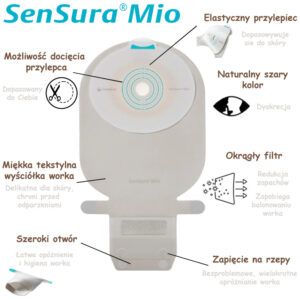 SenSura® Mio worek 1-częściowy otwarty to linia produktów stomijnych, które dzięki elastycznemu przylepcowi dopasowują się do kształtu każdego ciała. Produkty te zapewniają dyskrecję dzięki zastosowaniu neutralnego szarego materiału tekstylnego.
