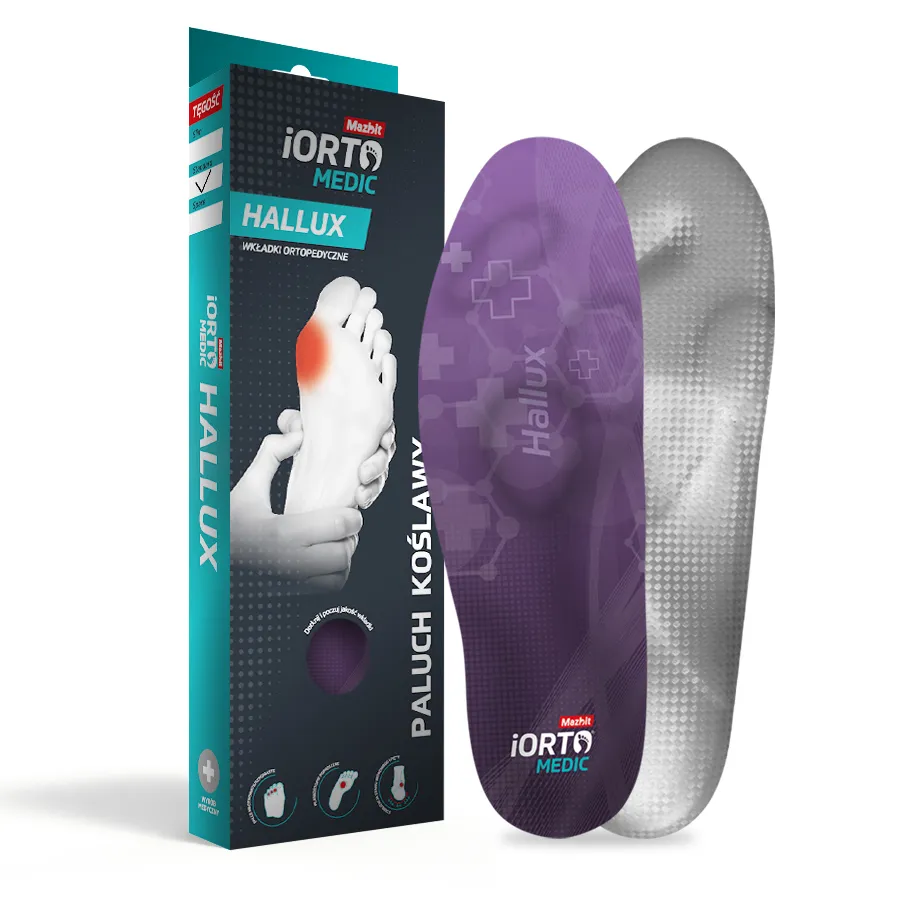 Wkładki iORTO Hallux dedykowane są osobom zmagającym się z problemem palucha koślawego. Ich użytkowanie wskazane jest w pierwszych dwóch etapach/stadiach schorzenia oraz profilaktycznie. Dzięki specjalnemu wyprofilowaniu, będą również pomocne w terapii palców młotkowatych i szponiastych, które często towarzyszą halluxom.
