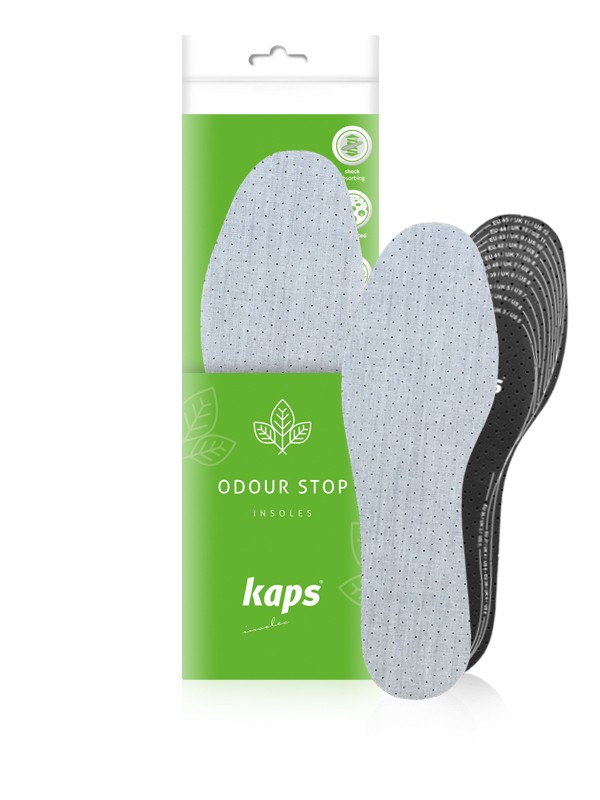 Odour Stop – to komfortowe i higieniczne wkładki dające uczucie świeżości stóp. Delikatna tkanina (wiskoza 52%, poliester 48%) oraz perforacja zapewniają odpowiednią cyrkulację powietrza pod stopami. Warstwa miękkiej pianki lateksowej zwiększa komfort chodzenia, a zawarty w niej węgiel aktywny zapobiega powstawaniu niepożądanego zapachu. Przeznaczone są do każdego rodzaju obuwia.